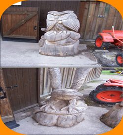 | Selbst aus Holz geschnitzte Figuren sind auf dem Gelände. |